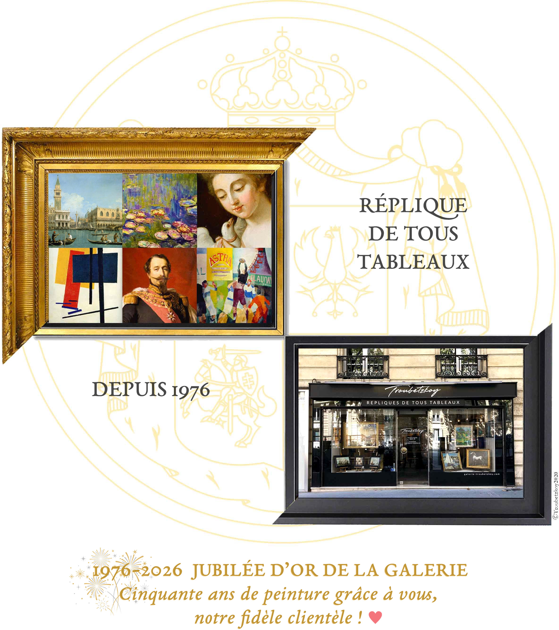 Une réplique Troubetzkoy est troublante parce qu’elle ressemble plus à un tableau original qu'à une copie de tableau... On admire autant la beauté que la crédibilité du résultat, voilà ce que vous pouvez attendre d'une réplique.D'une belle copie, on dit (dans le meilleur des cas) qu'elle est "très bien faite" ; d'une réplique on ne dit rien, on ne la questionne même pas : c'est la même que l'original ! La galerie Troubetzkoy à Paris bluffe ses clients les plus experts depuis 50 ans.